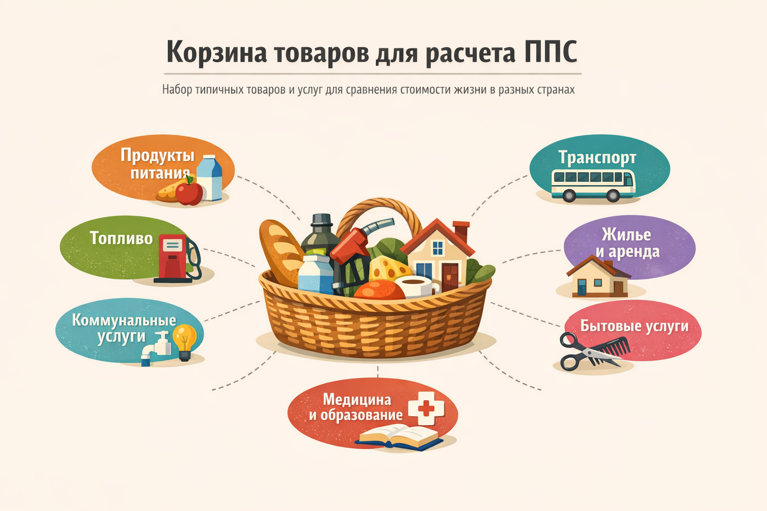 Чтобы сравнение не сводилось к одному товару, используется «корзина товаров». Это репрезентативный набор повседневных расходов: продукты питания, топливо, коммунальные услуги, транспорт, аренда жилья и базовые сервисы. Сравнение стоимости такой корзины позволяет получить более реалистичную картину покупательной способности валют.