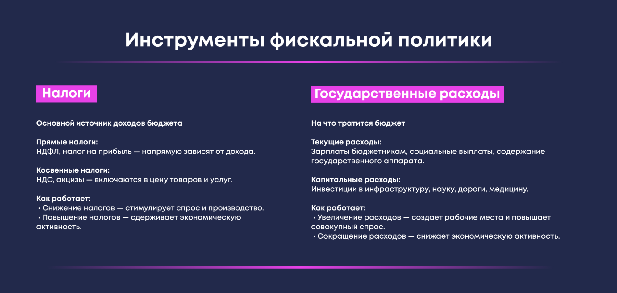 Фискальная политика реализуется через два базовых инструмента — налоговую систему и государственные расходы. Именно их изменение позволяет государству влиять на экономическую динамику.