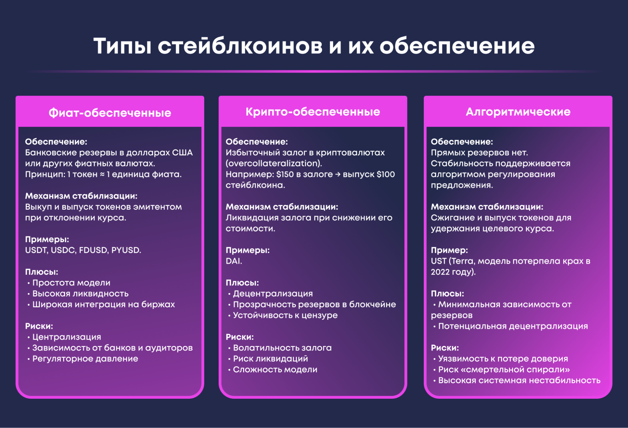 Алгоритмический стейблкоин UST потерял привязку в 2022 году из-за недостатков алгоритмической модели, которая при потере доверия спровоцировала неконтролируемую эмиссию вспомогательного токена LUNA (спираль смерти). Модель оказалась чувствительной к потере доверия. Вероятность аналогичных событий зависит от конструкции конкретного стейблкоина: фиатно-обеспеченные и избыточно коллатерализованные модели имеют иную структуру рисков, но полностью исключить системные риски невозможно.