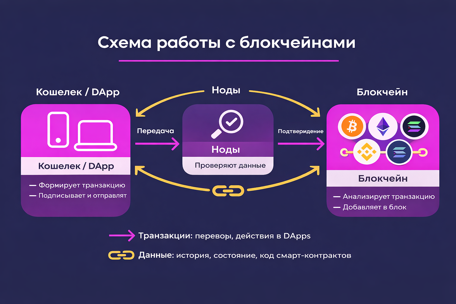 Изображение 1. Упрощенная схема работы кошелька с блокчейнами