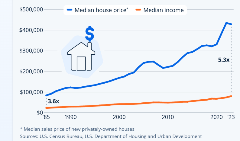 Если в середине 80-ых американскому домохозяйству требовалось потратить 3,6 своего годового дохода на недвижимость, то к текущему моменту это значение выросло до 5,3.
