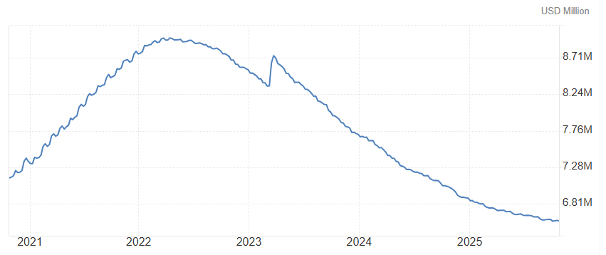 С 2022 года ФРС начала сокращать свой баланс. Источник: tradingeconomics