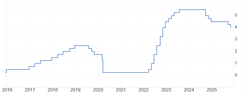 Цикл снижения ставки ФРС продолжается, хоть и не столь быстрыми темпами, какие хотел бы видеть президент Трамп. Источник: tradingeconomics