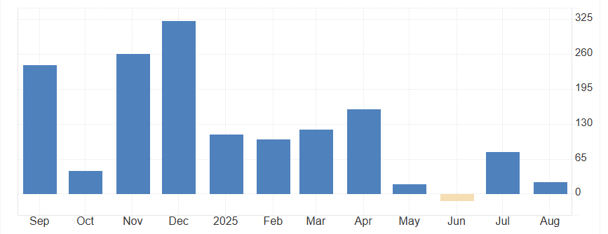 Динамика увеличения числа занятых в несельскохозяйственном секторе США за последний год. Данных за сентябрь нет из-за шатдауна. Источник: tradingeconomics