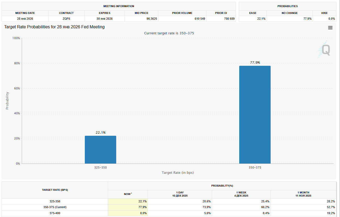 FedWatch Tool показывает, что трейдеры ожидают сохранение ставки на текущих уровнях на следующем заседании, которое пройдет 28 января 2026 года. Источник: FedWatch Tool