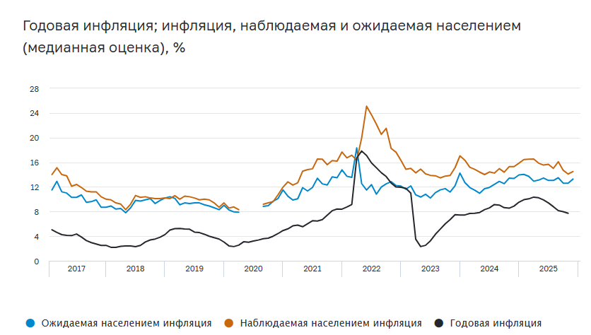 В ноябре инфляционные ожидания населения увеличились до 13,3%, а наблюдаемая инфляция выросла до 14,5%. Это произошло на фоне ожиданий роста цен из-за повышения НДС с 20% до 22%.