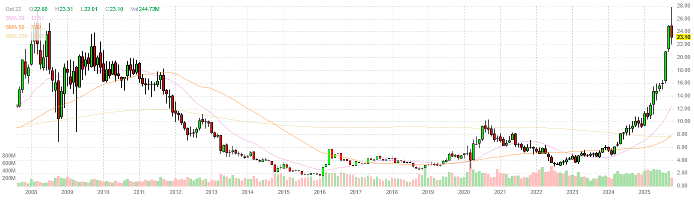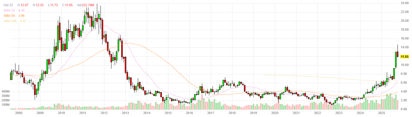 Как видно на графике, акции Kinross Gold не смогли закрепиться выше максимумов, показанных в далеком 2008 году! В то время цена золота стремилась к скромным (по нынешним меркам) $1000 за унцию, а в 2025 году превысила $4000 за унцию. Более того, акции многие годы находились в «депрессии», и лишь сильнейшее ралли на рынке золота в 2024—2025 годах помогло вернуть их к жизни. Почему это произошло?