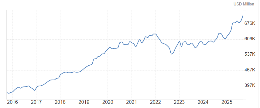 Золотовалютные резервы России в последнее десятилетие демонстрировали устойчивый рост. Оценка включает замороженные резервы. График: tradingeconomics